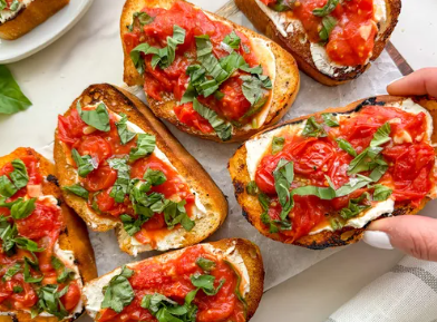 바게트에 토마토, 바질, 모짜렐라 등을 얹기만 하면 완성되는 이탈리안 핑거푸드.